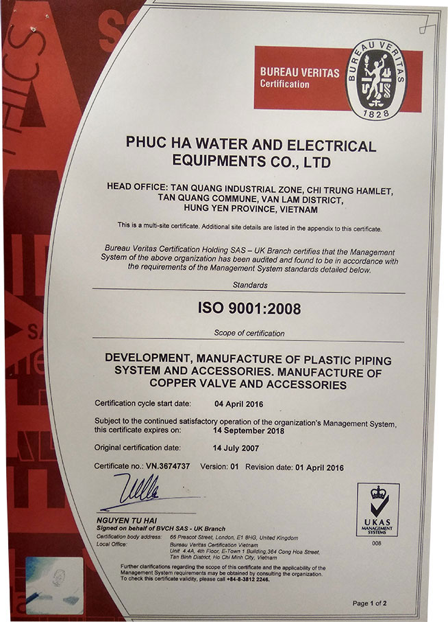 ISO 9001:2008 quality management system certificate for DEKKO branded products of the Group including: PPR plastic pipes, HDPE pipes, u.PVC pipes, etc. This certificate will be valid in within 3 years from April 4, 2016 to September 14, 2018.