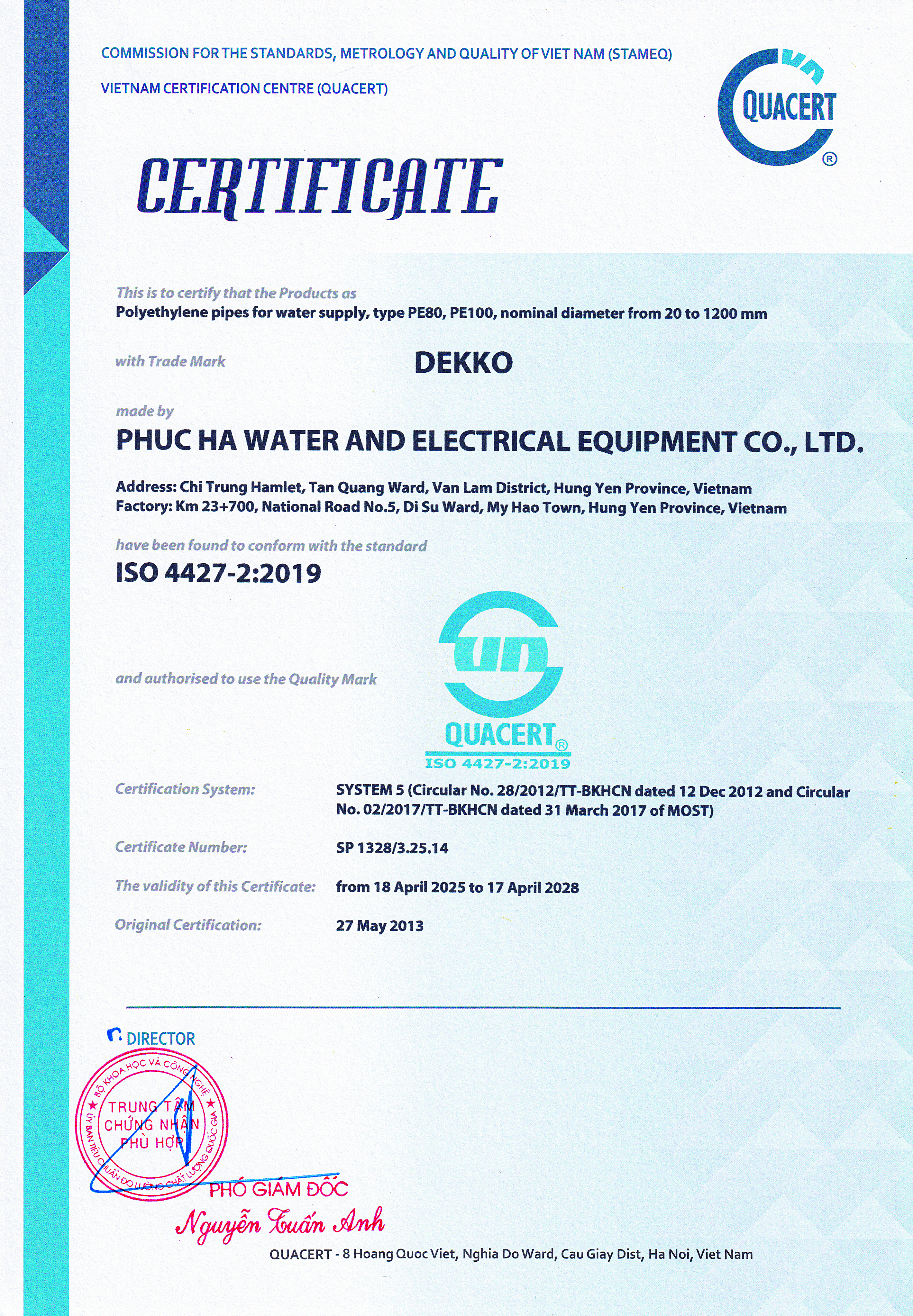 22/05/2025HDPE pipes with DEKKO brand of DEKKO Group have been certified by the General Department of Standards, Metrology and Quality – QUACERT Conformity Certification Center in accordance with the requirements of ISO 4427-2:2007