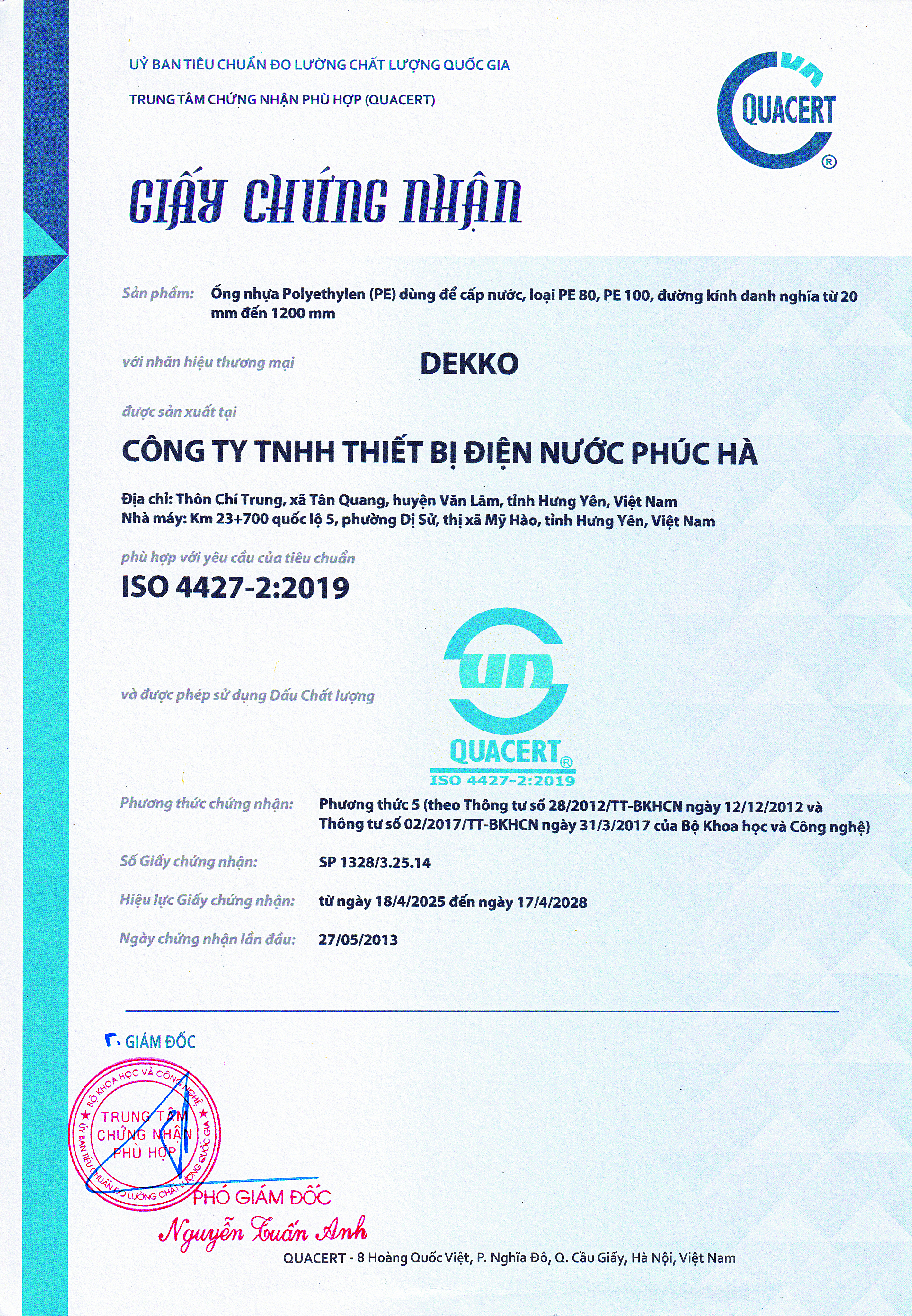 22/05/2025Ống nhựa HDPE mang thương hiệu DEKKO của Tập Đoàn DEKKO đã được Tổng cục tiêu chuẩn đo lường chất lượng – Trung tâm chứng nhận phù hợp QUACERT cấp Giấy chứng nhận phù hợp với yêu cầu của tiêu chuẩn ISO 4427-2:2019.