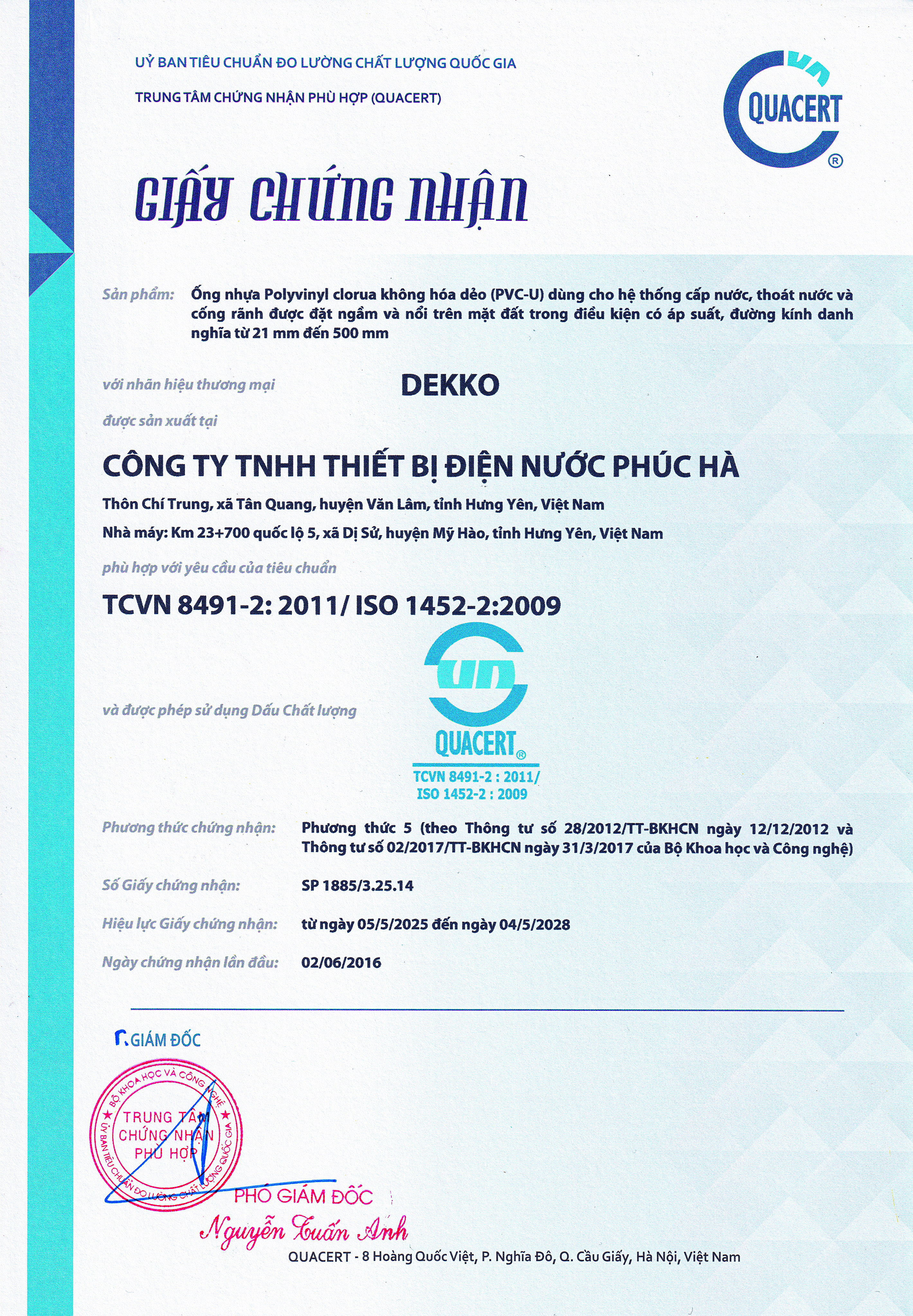 22/05/2025Ống nhựa Polyvinyl Chlorua không hóa dẻo (uPVC) dùng để cấp nước, đường kính danh nghĩa từ 21mm đến 500mm của Tập Đoàn DEKKO đã được Tổng cục tiêu chuẩn do lường chất lượng – Trung tâm chứng nhận phù hợp (Quacert) cấp giấy chứng nhận Tiêu chuẩn TCVN 8491-2:2011/ ISO 1452-2:2009.