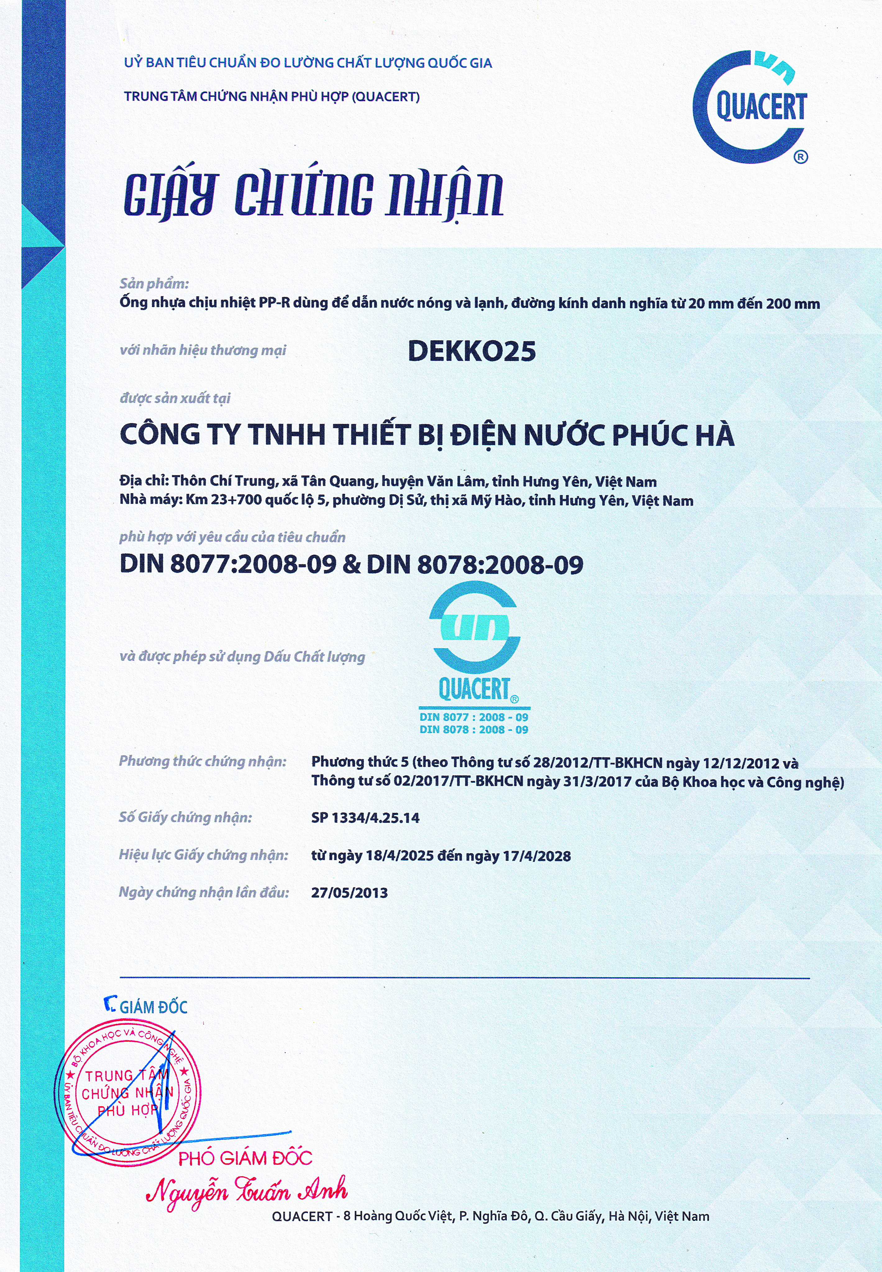 22/05/2025Công ty Cổ phần Dekko đã được Tổng cục Tiêu chuẩn đo lường chất lượng Cấp Giấy chứng nhận Tiêu chuẩn DIN 8077:2008-09&DIN 8078:2008-09 cho dòng sản phẩm ống nhựa chịu nhiệt PPR để dẫn nước nóng và lạnh, nhóm kích thước A, đường kính danh nghĩa từ 20mm đến 200mm.